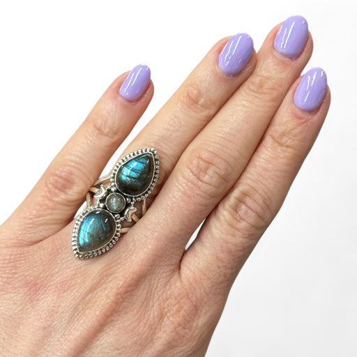 This Labradorite ring is set in sterling silver and features a crystalline form of feldspar, often grey in color, with a stunning iridescent “flash...